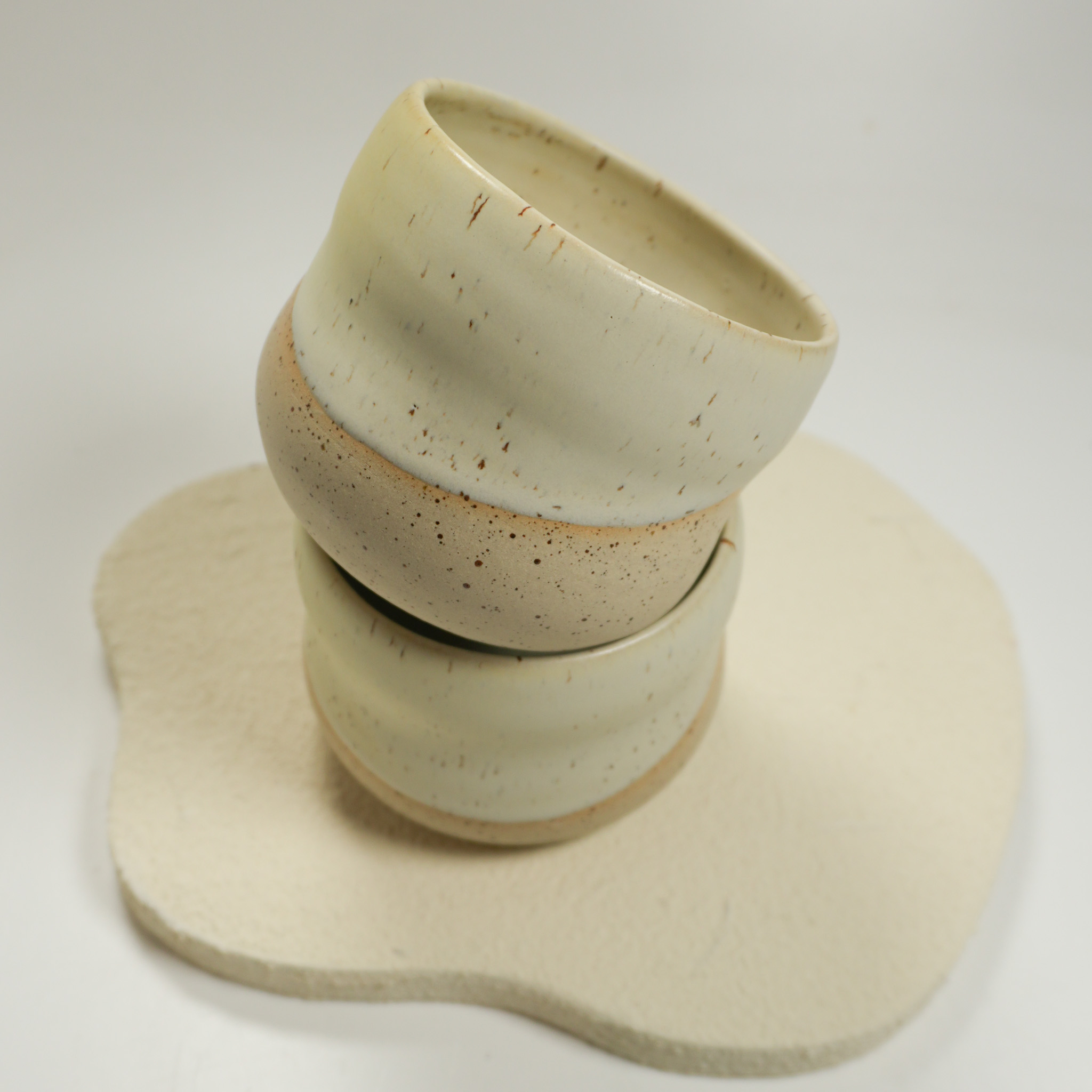 Handgefertigter Becher aus Steinzeug mit einer einfarbigen Glasur. Auf dem nacktem Ton mit Spots ist die Keramik mit Weiß-Beiger Glasur überzogen.  Jeder Becher ist mit viel Liebe handgemacht und dadurch ein Unikat mit leicht variierendem Farbverlauf und kann in Form und Farbe leicht variieren.