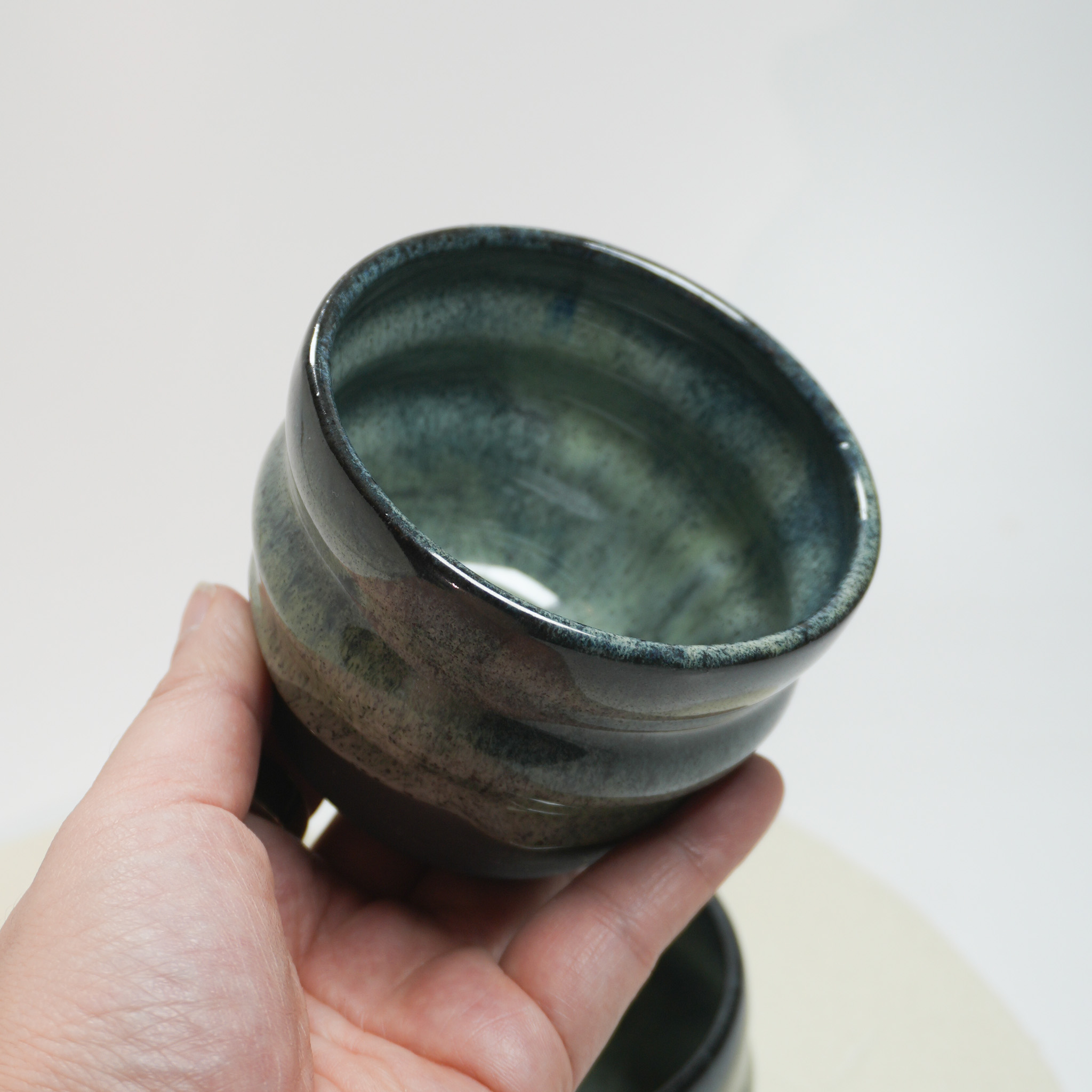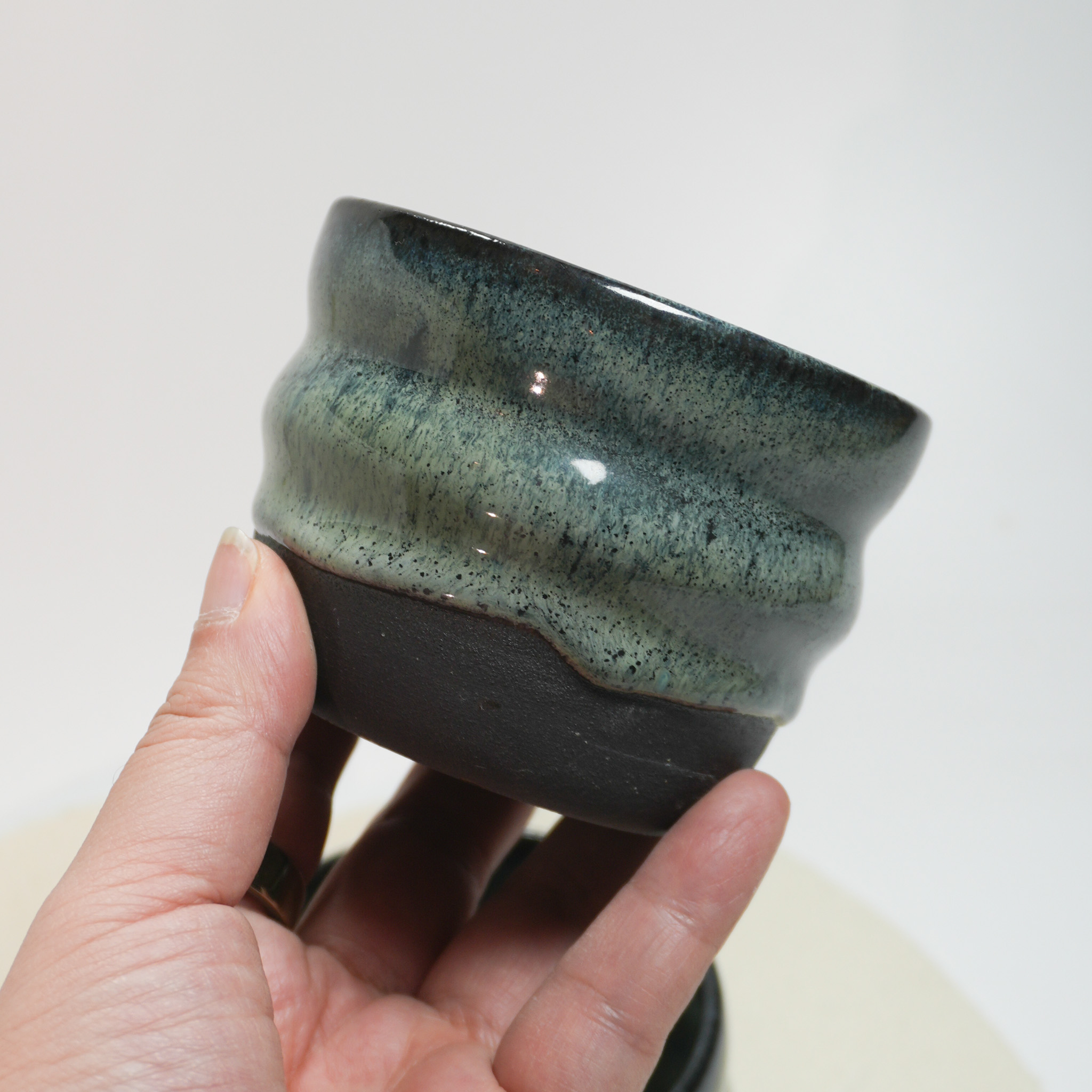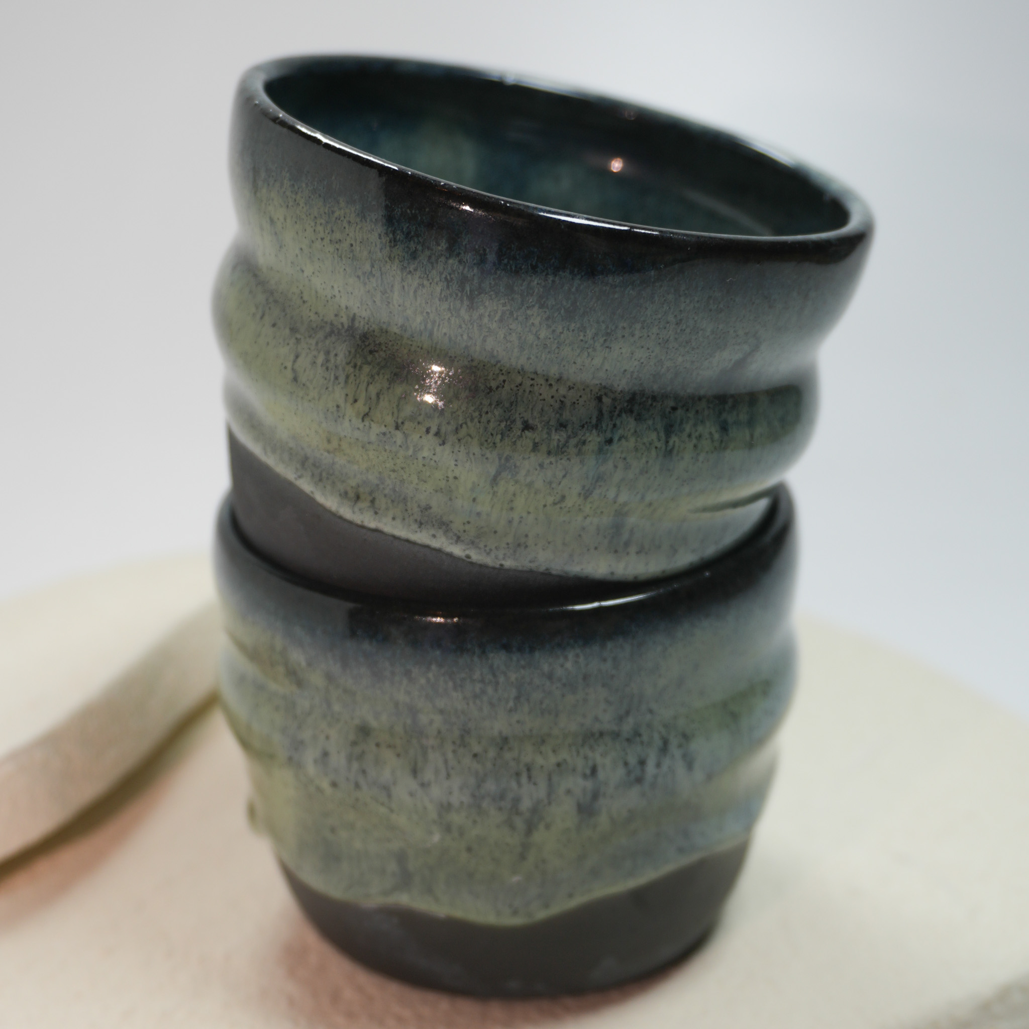 Handgefertigter Becher aus schwarzem Steinzeug mit einfarbigen Glasur mit tollen Effekt. Die obere Hälfte ist in einem grün-blauen Verlauf glasiert, die untere Hälfte legt den nackten Ton frei. Jeder Becher ist mit viel Liebe handgemacht und dadurch ein Unikat mit leicht variierendem Farbverlauf und kann in Form und Farbe leicht variieren.