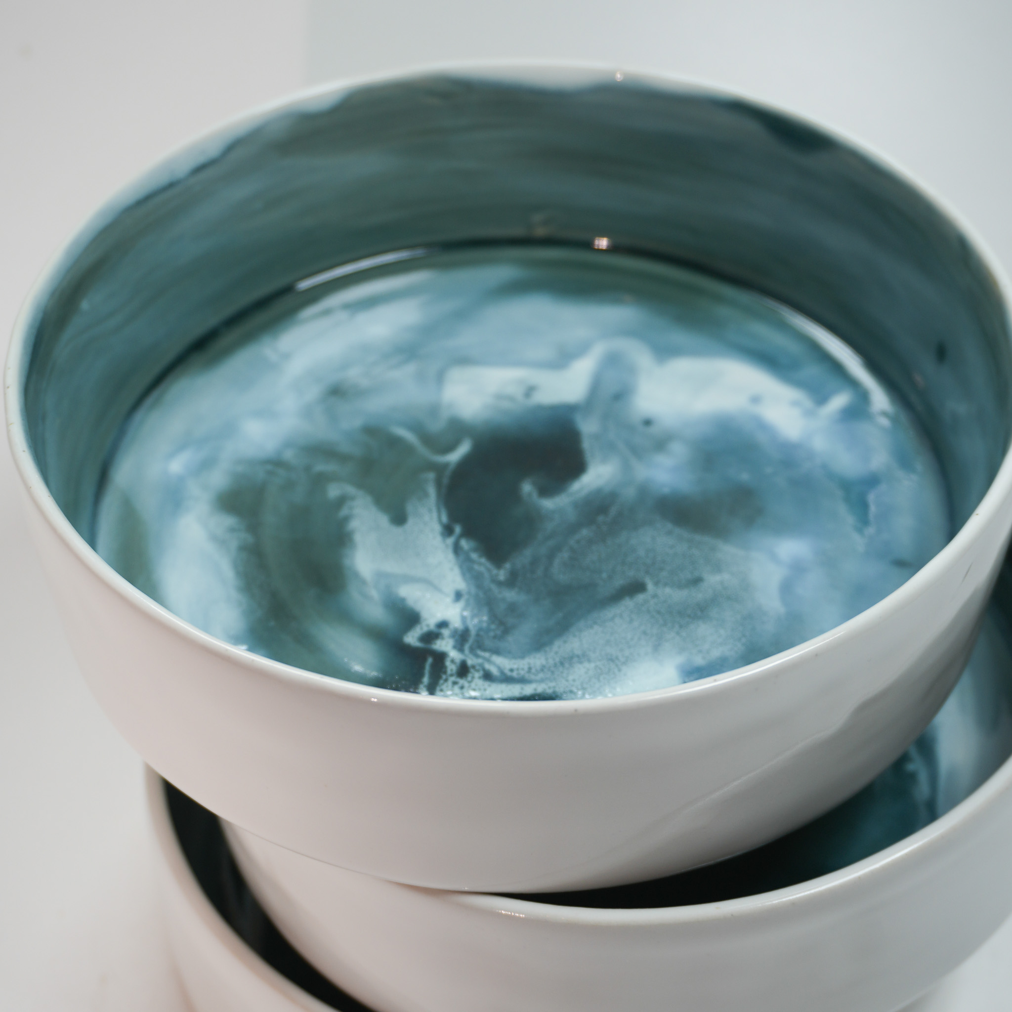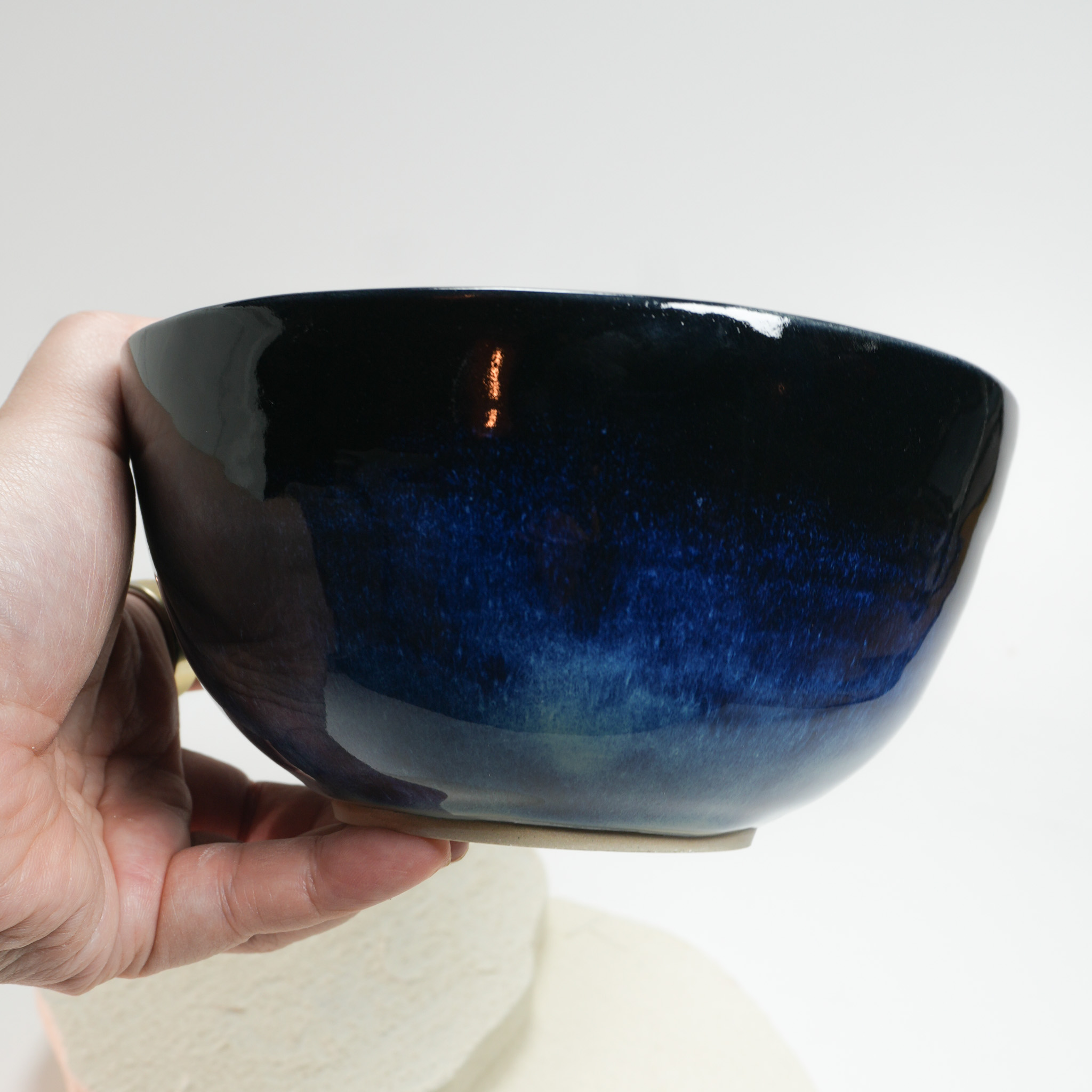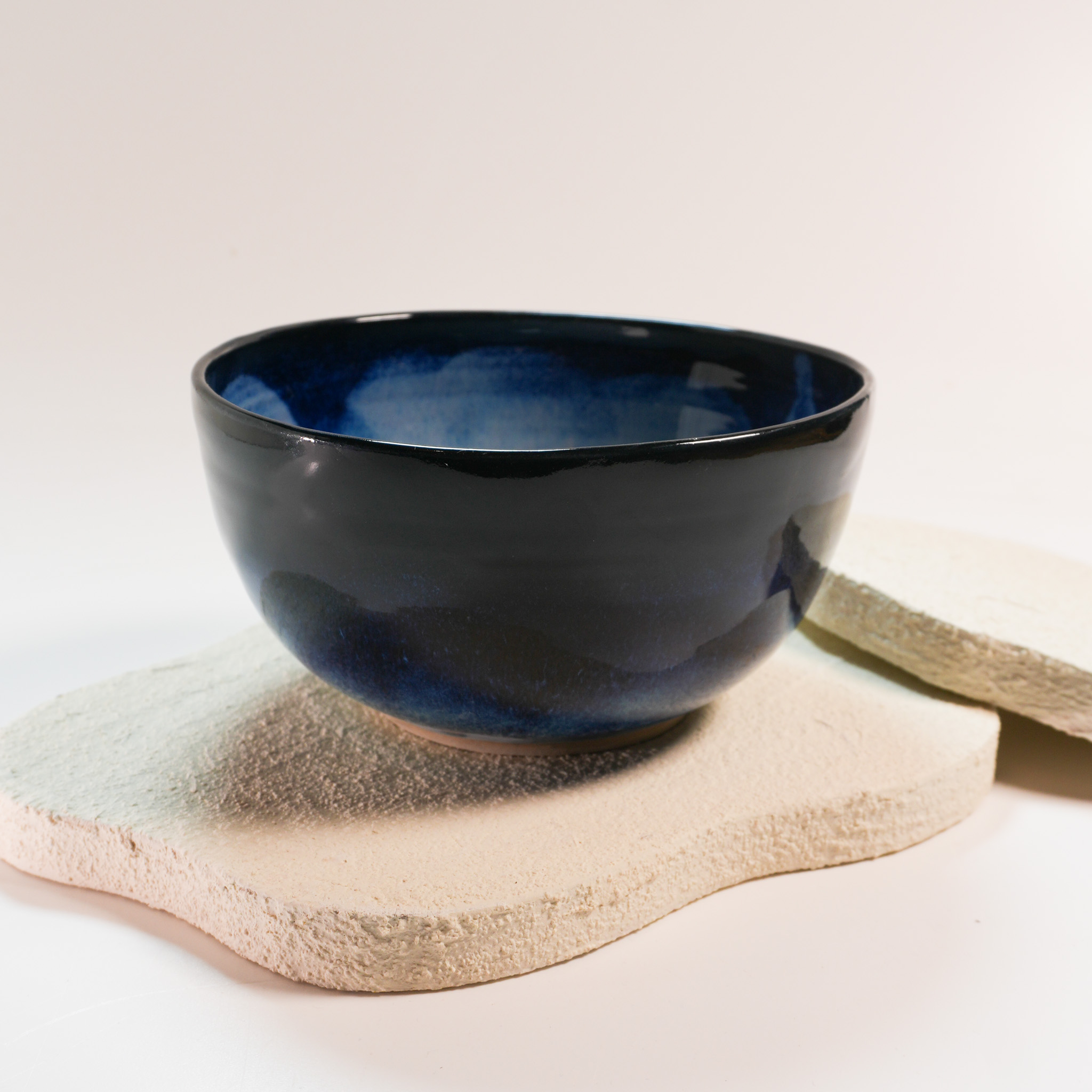 Handgefertigte Bowl aus Steinzeug mit einer schwarzen Glasur als Untergrund. Die Schüssel ist so glasiert, dass die blaue Farbe durscheint und einen mystischen Look hervorbringt. Jede Bowl ist mit viel Liebe handgemacht und dadurch ein Unikat mit leicht variierendem Farbverlauf und kann in Form und Farbe leicht variieren.