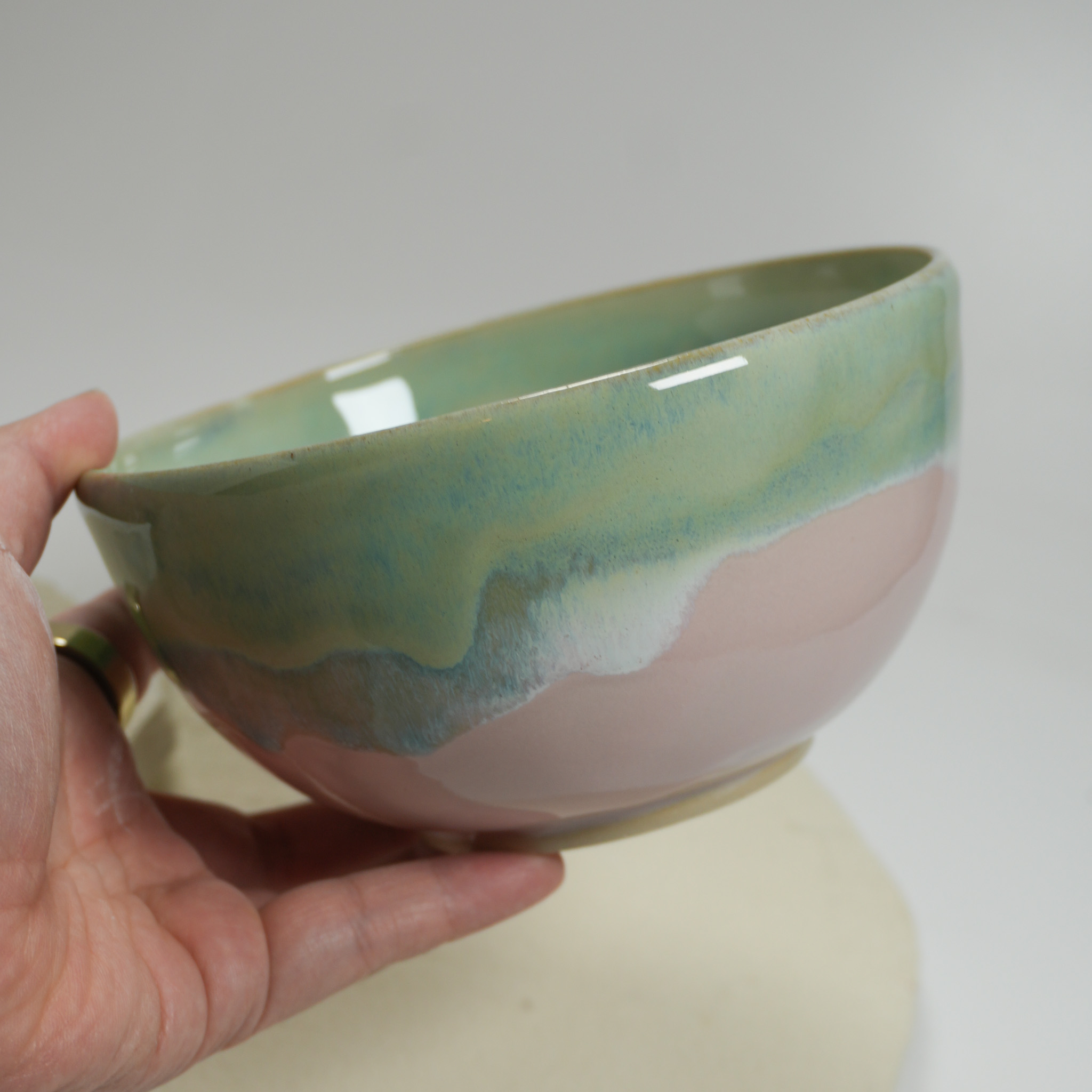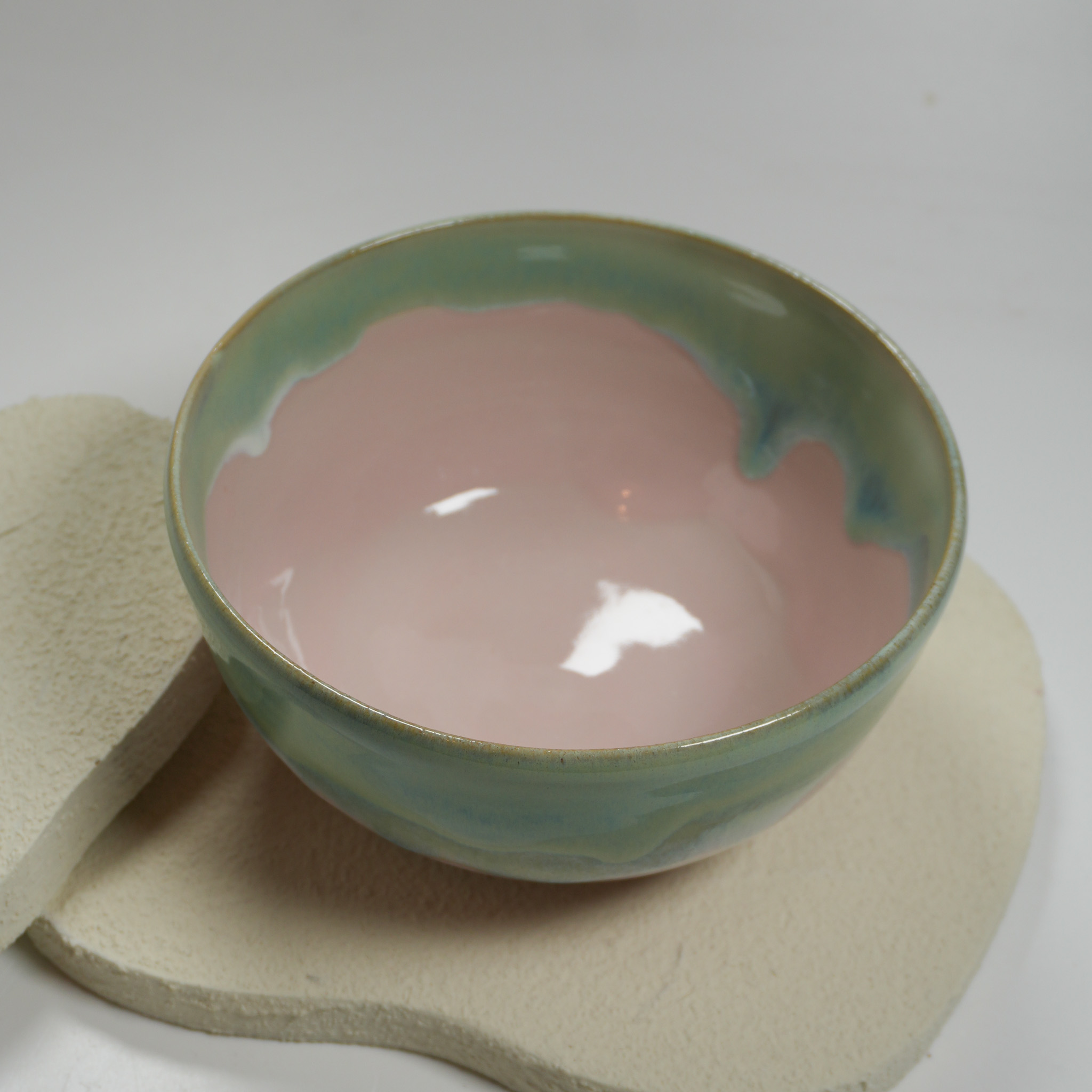 Handgefertigte Bowl aus Steinzeug mit einer zweifarbigen Glasur. Die obere Hälfte ist in einem grün-blauen Verlauf glasiert, der in einen rosafarbenen Untergrund übergeht – inspiriert vom einem leckerem Strawberry Matcha. Jede Bowl ist mit viel Liebe handgemacht und dadurch ein Unikat mit leicht variierendem Farbverlauf und kann in Form und Farbe leicht variieren.
