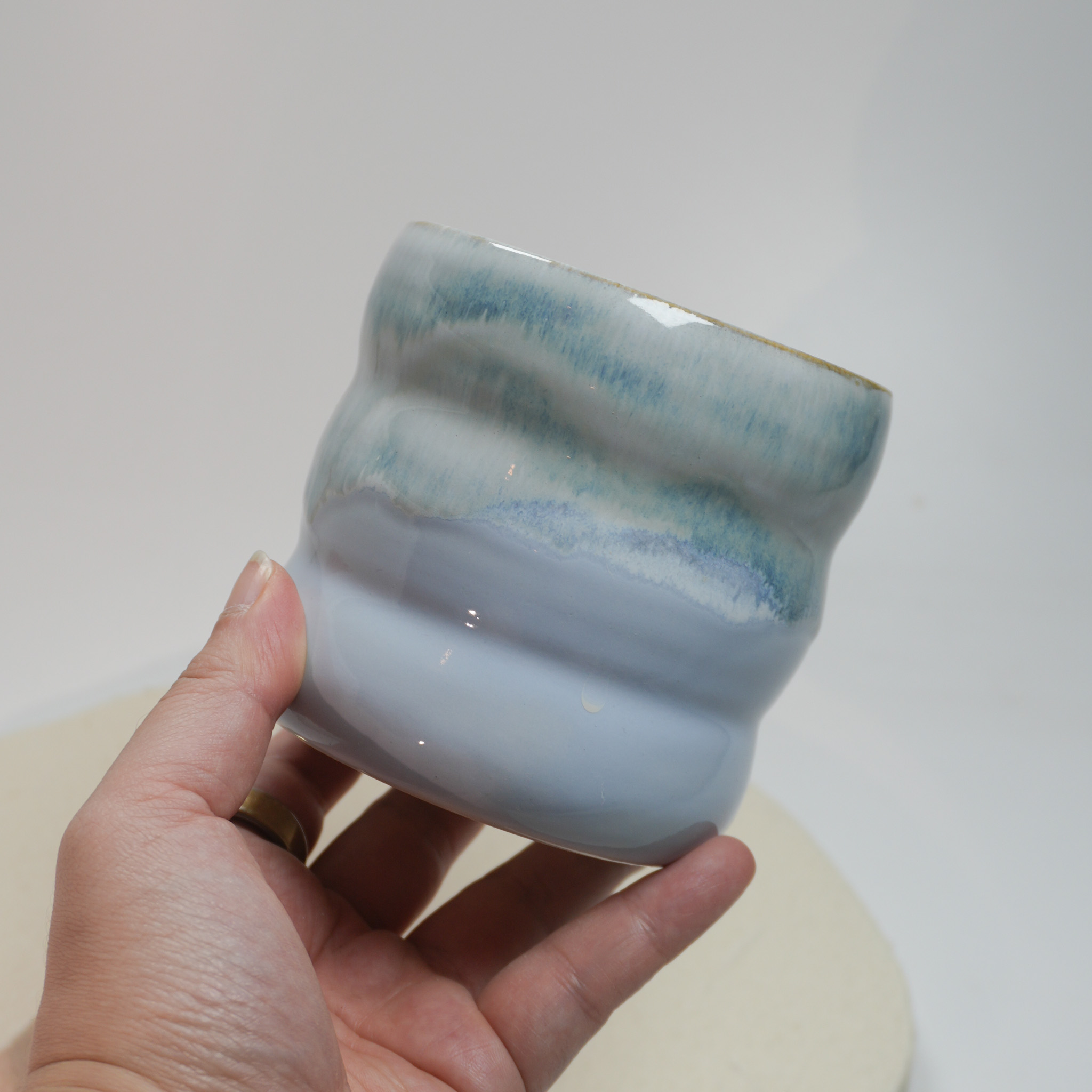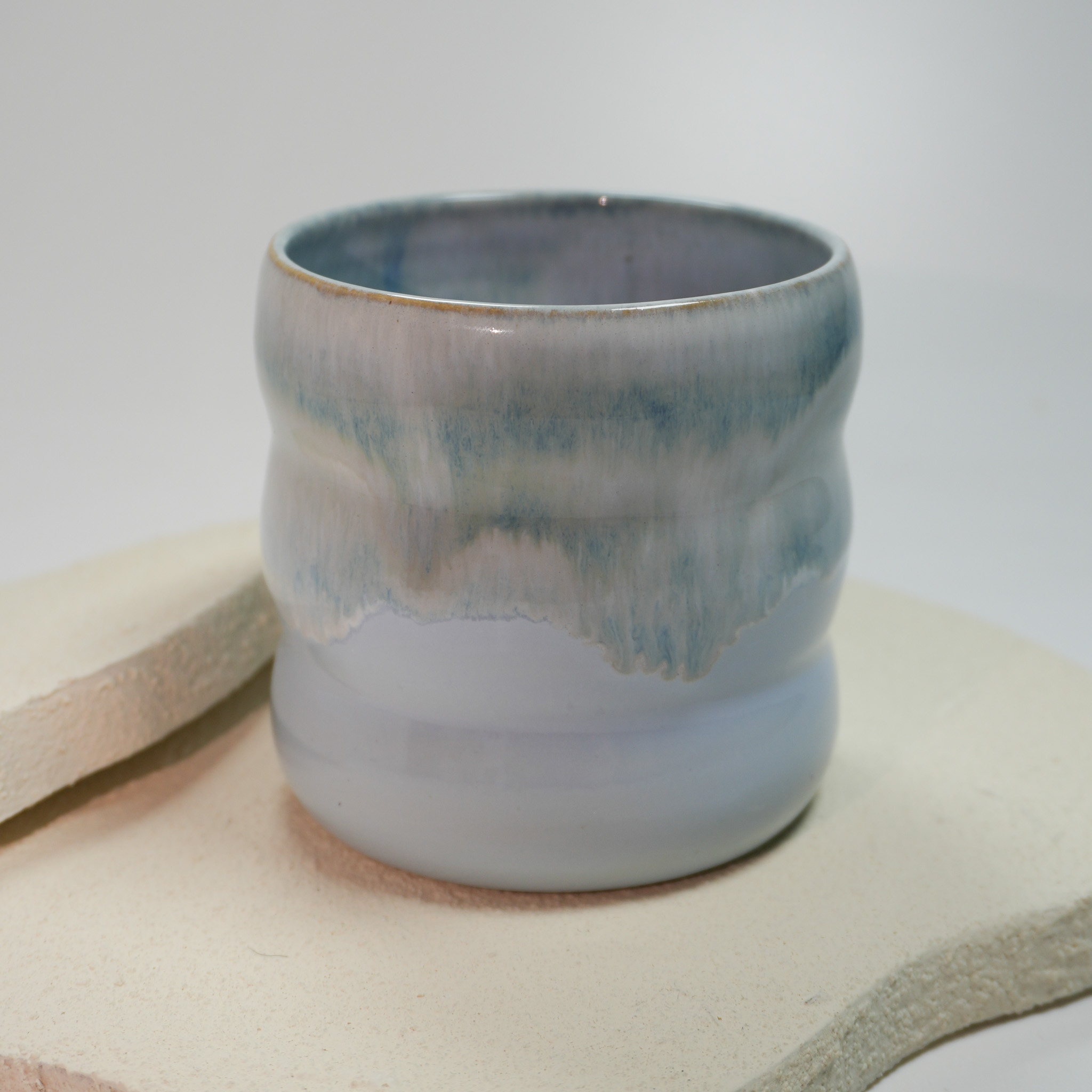Handgefertigter Becher aus Steinzeug mit einer zweifarbigen Glasur. Die obere Hälfte ist in einem weiß-beigen Verlauf glasiert, der in einen blauen Untergrund übergeht – wie geschmolzen. Jeder Becher ist mit viel Liebe handgemacht und dadurch ein Unikat mit leicht variierendem Farbverlauf und kann in Form und Farbe leicht variieren.