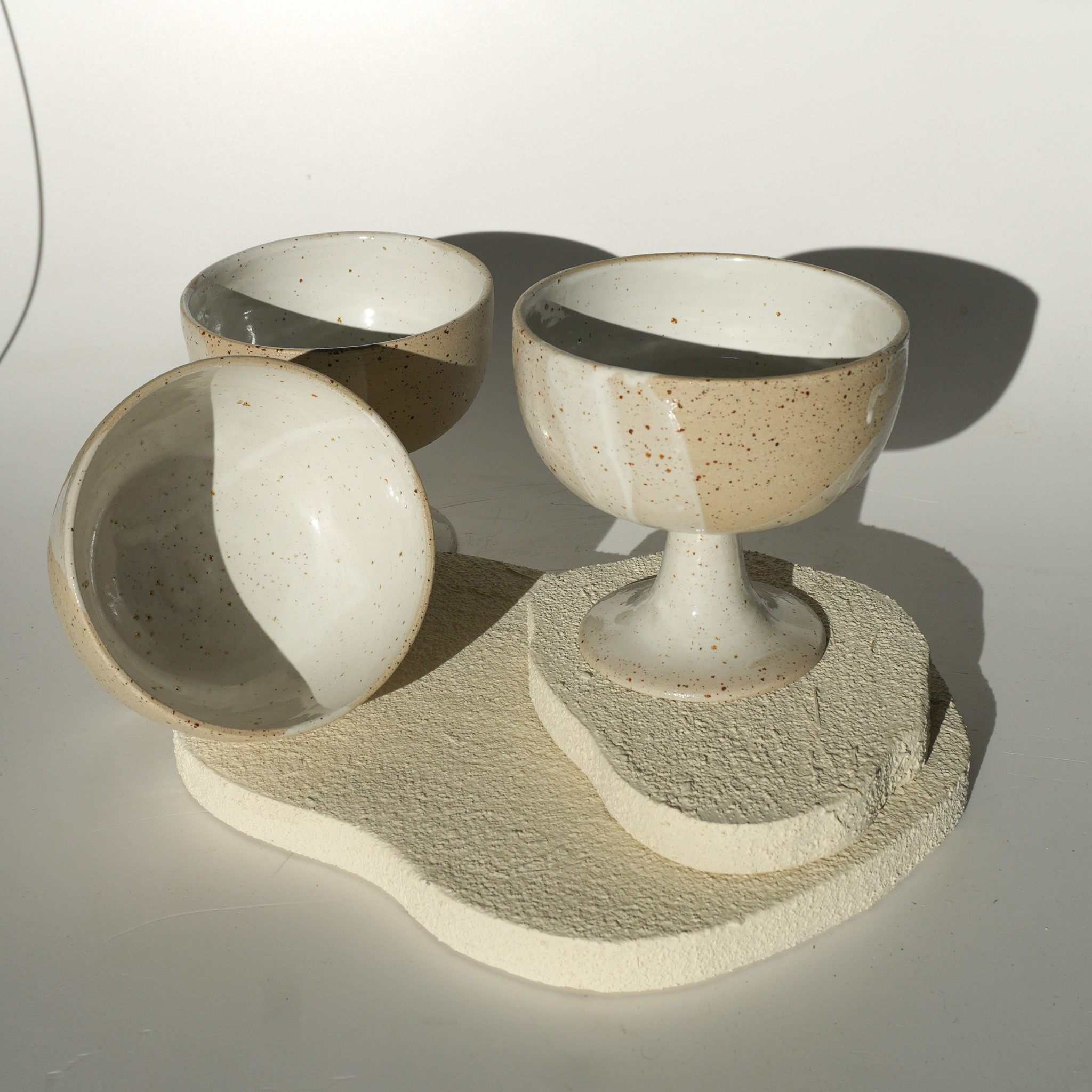 Handgefertigte Dessertschale aus Steinzeug mit einer einfarbigen Glasur. Auf dem nacktem Ton mit Spots sind Spritzer von weißer Glasur. Jede Schale ist mit viel Liebe handgemacht und dadurch ein Unikat mit leicht variierendem Farbverlauf und kann in Form und Farbe leicht variieren.