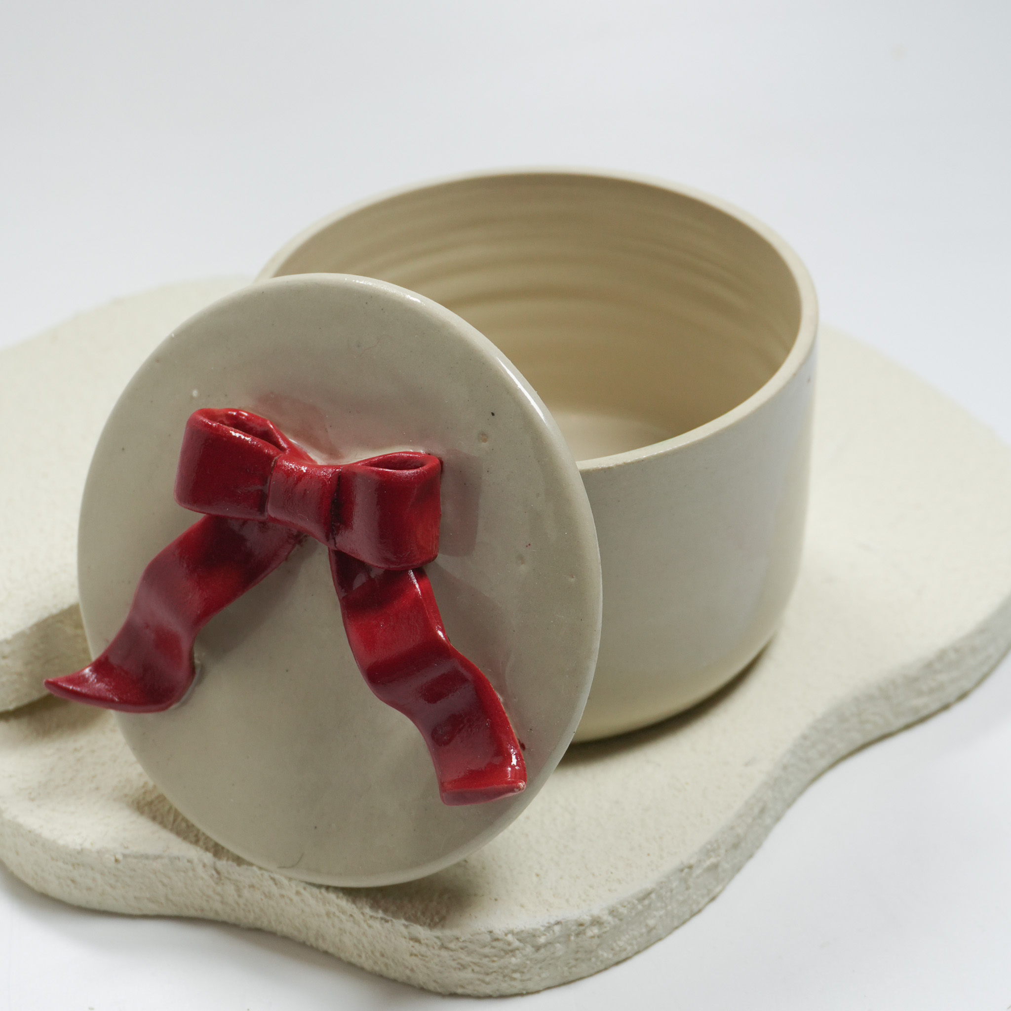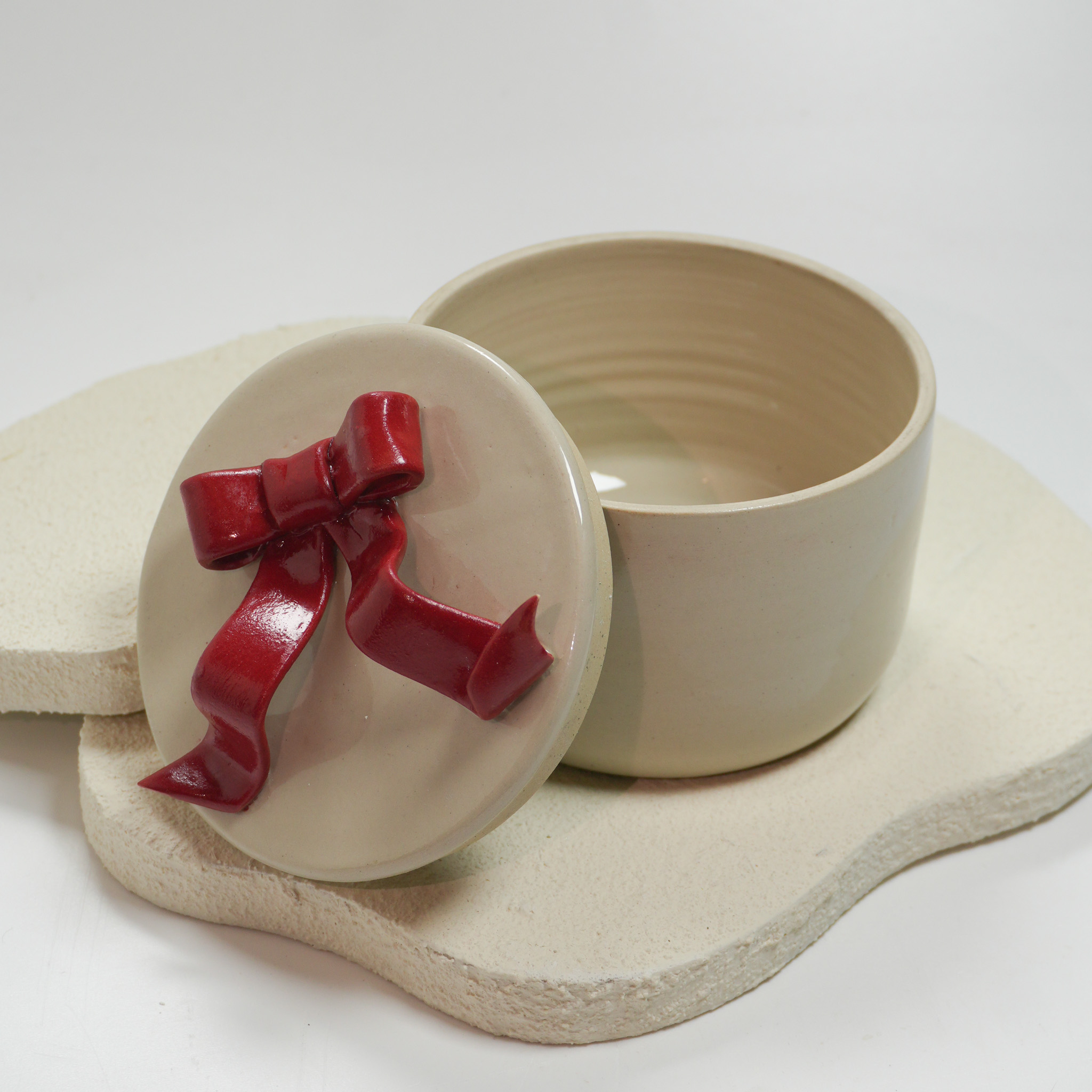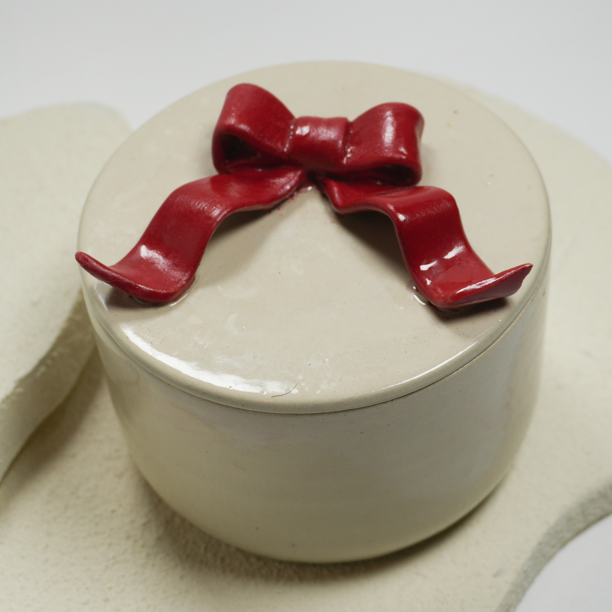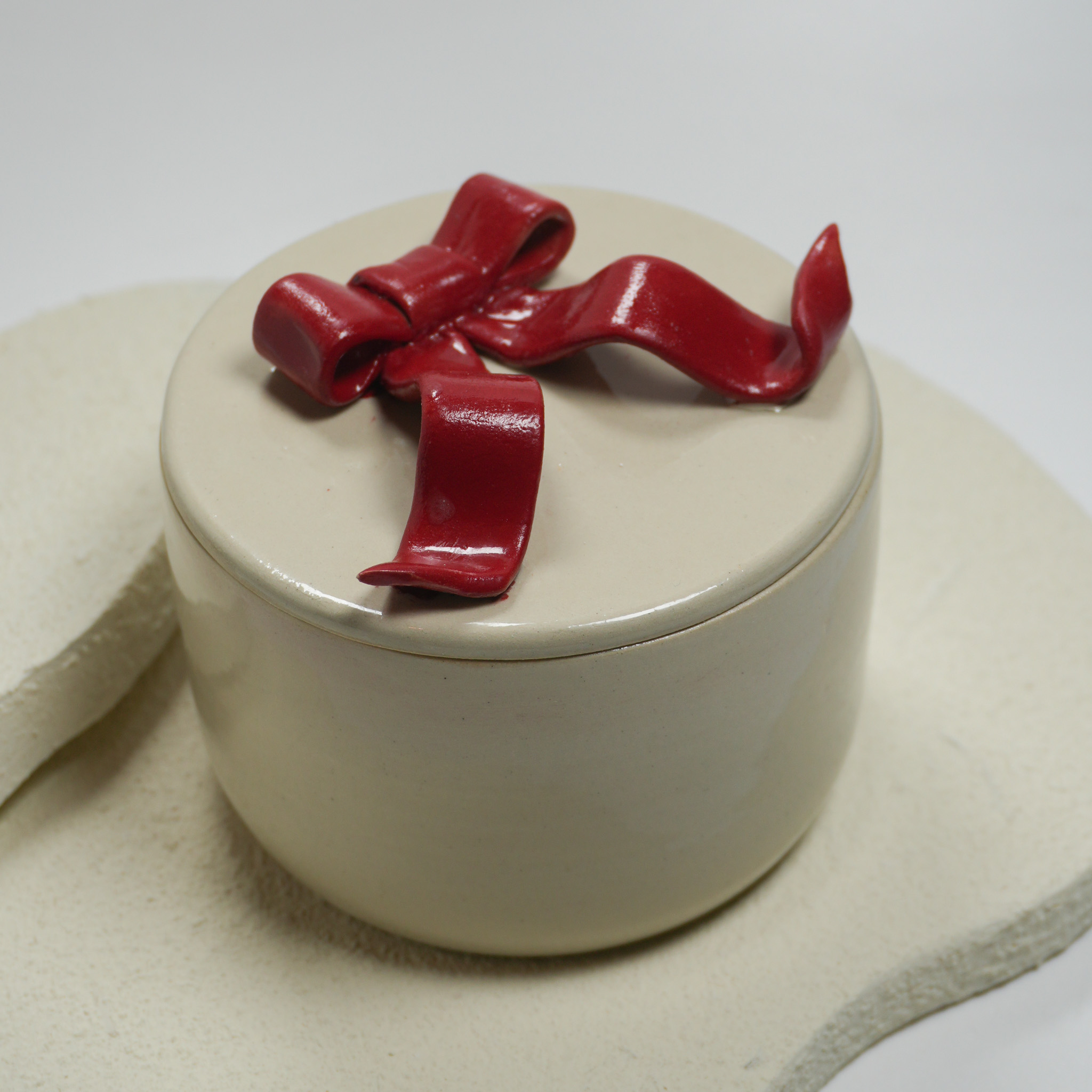 Handgefertigte Dose mit aus Steinzeug mit einer transparenter Glasur. Die Dose ist verziert mit einer roten Schleife die ebenfalls aus Keramik ist. Dose ist mit viel Liebe handgemacht und dadurch ein Unikat mit leicht variierendem Farbverlauf und kann in Form und Farbe leicht variieren.