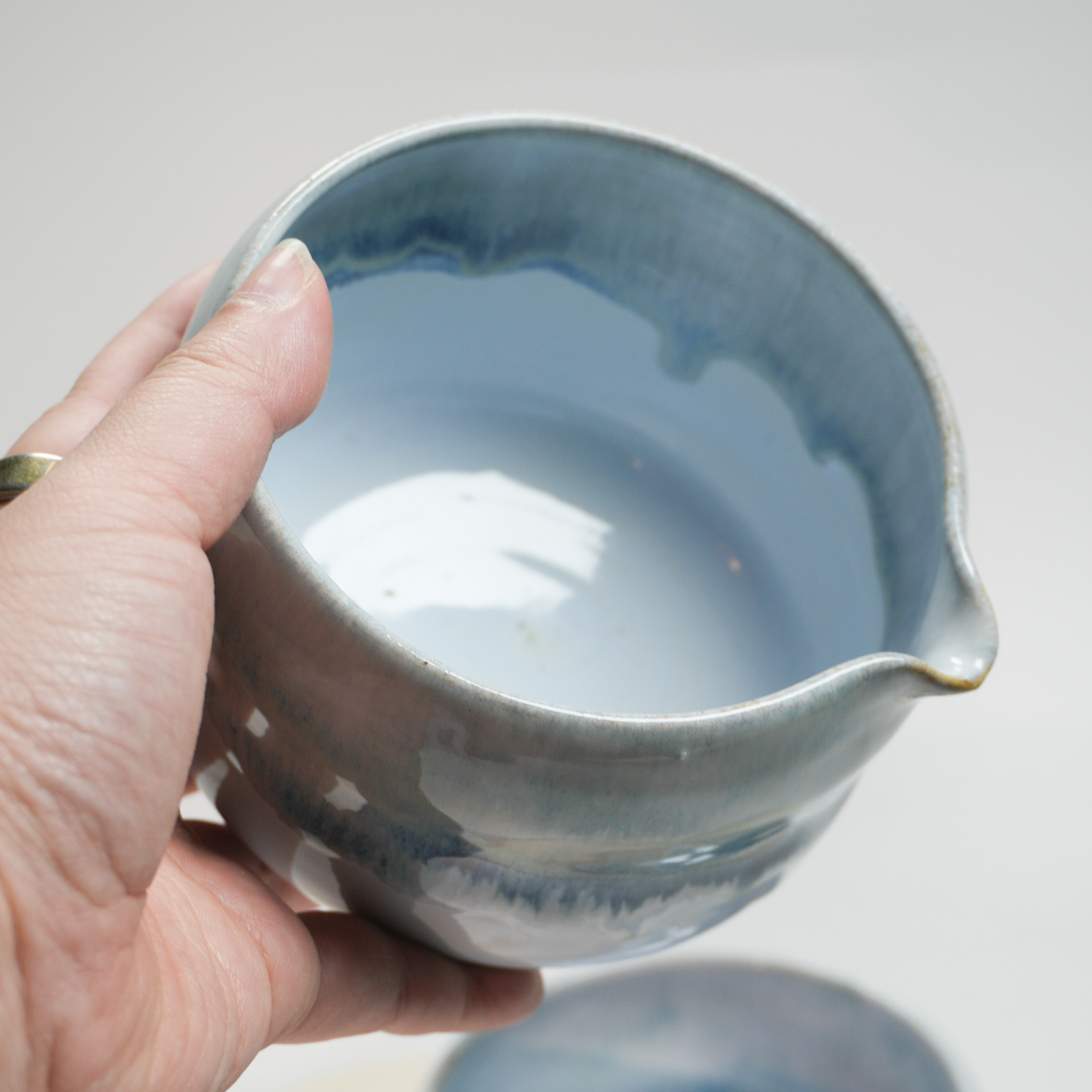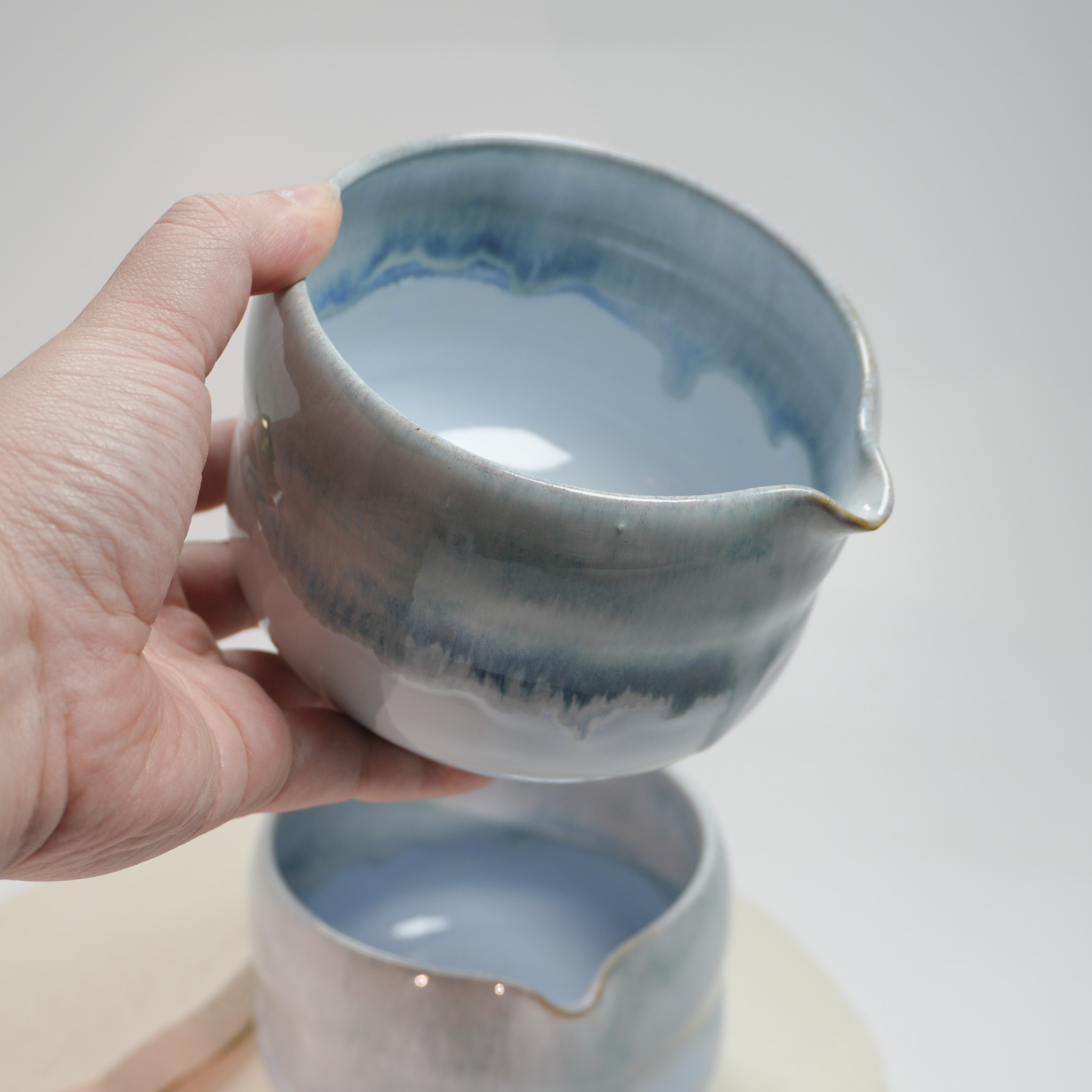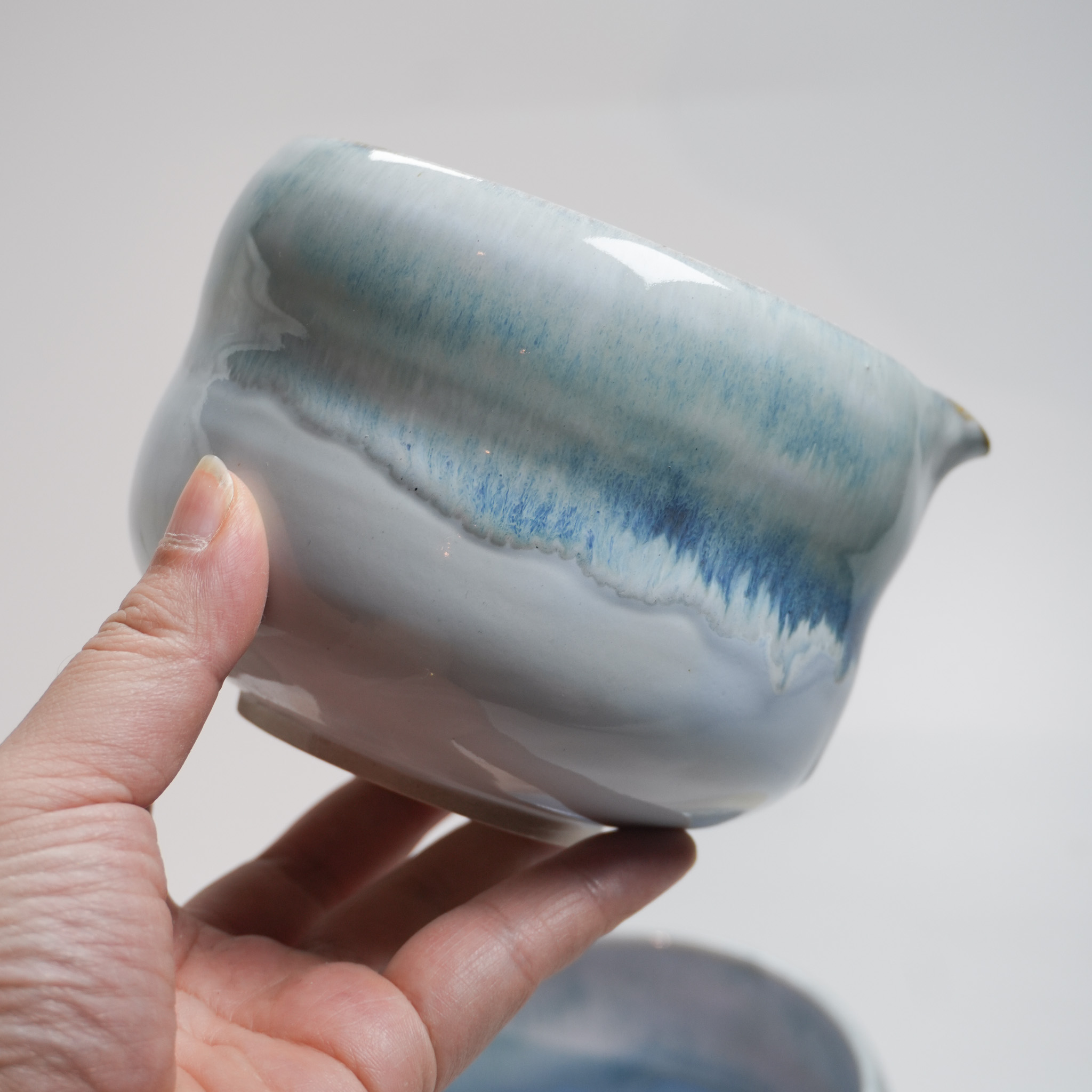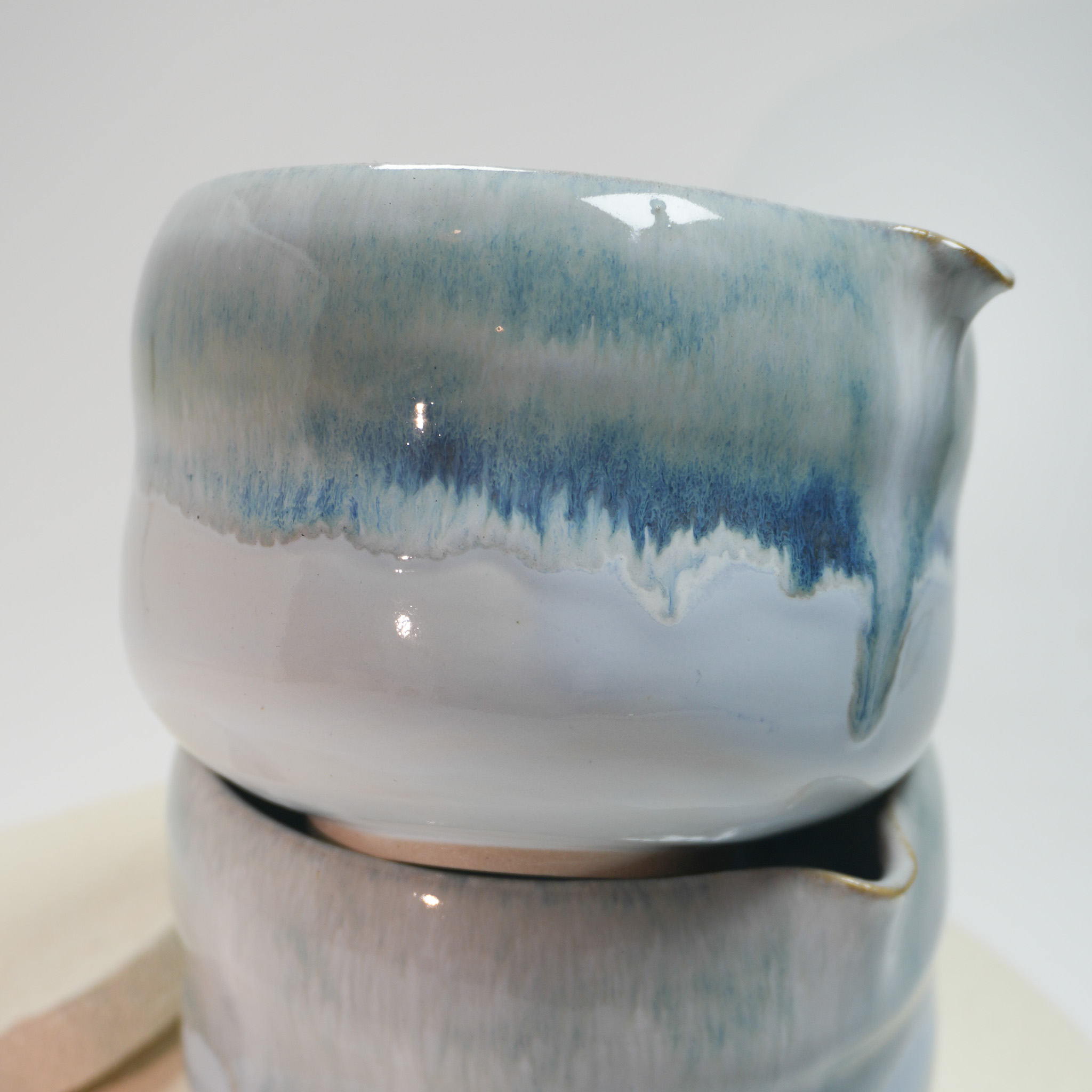 Handgefertigte Matcha Bowl aus Steinzeug mit einer zweifarbigen Glasur. Die obere Hälfte ist in einem blauen Verlauf glasiert, der in einen blauen Untergrund übergeht – wie geschmolzen. Jede Bowl ist mit viel Liebe handgemacht und dadurch ein Unikat mit leicht variierendem Farbverlauf und kann in Form und Farbe leicht variieren.