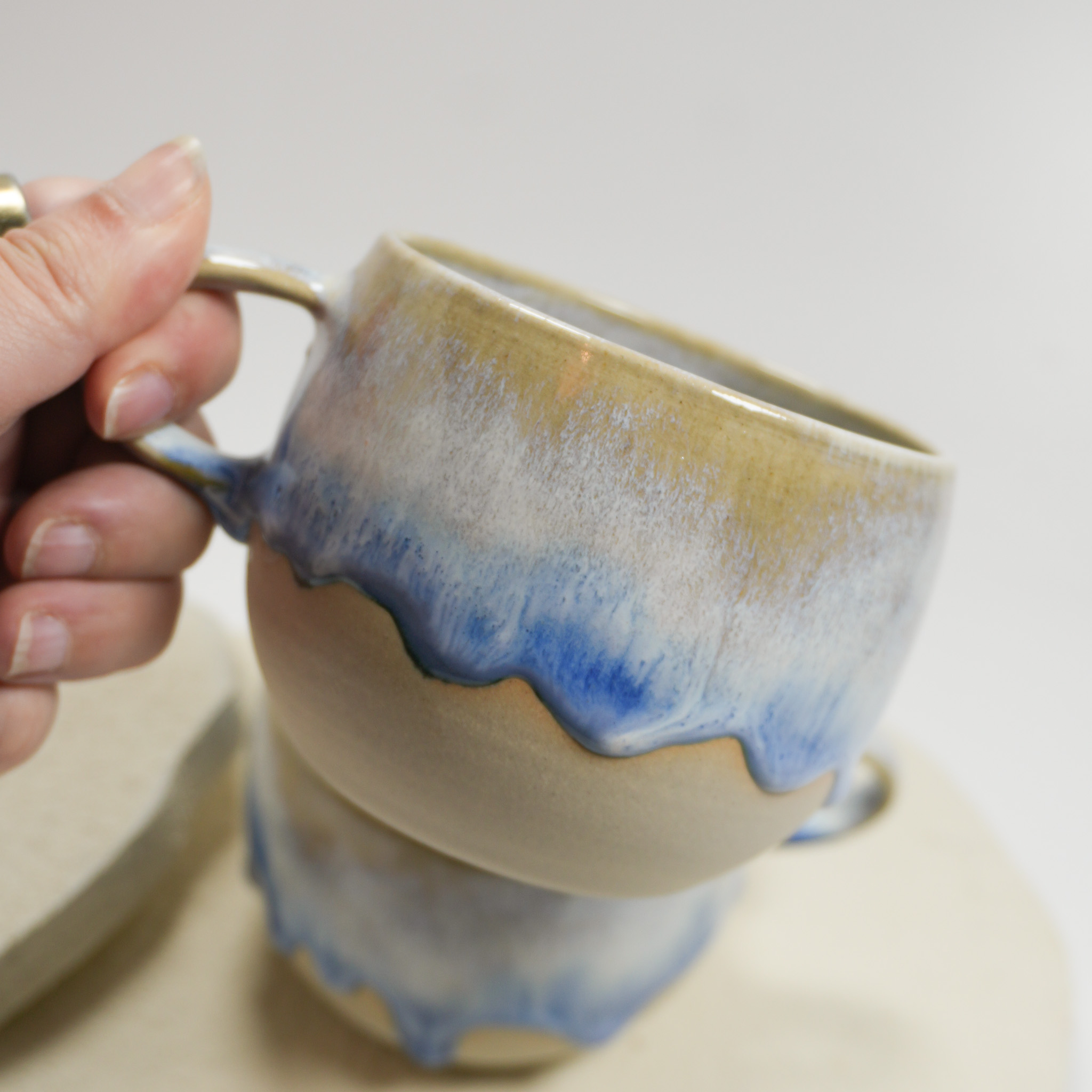 Handgefertigte Tasse aus Steinzeug mit einer zweifarbigen Glasur. Die Tasse ist so glasiert, dass alle Farben ineinander laufen und einen tollen Effekt erzeugen. Jede Tasse ist mit viel Liebe handgemacht und dadurch ein Unikat mit leicht variierendem Farbverlauf und kann in Form und Farbe leicht variieren.