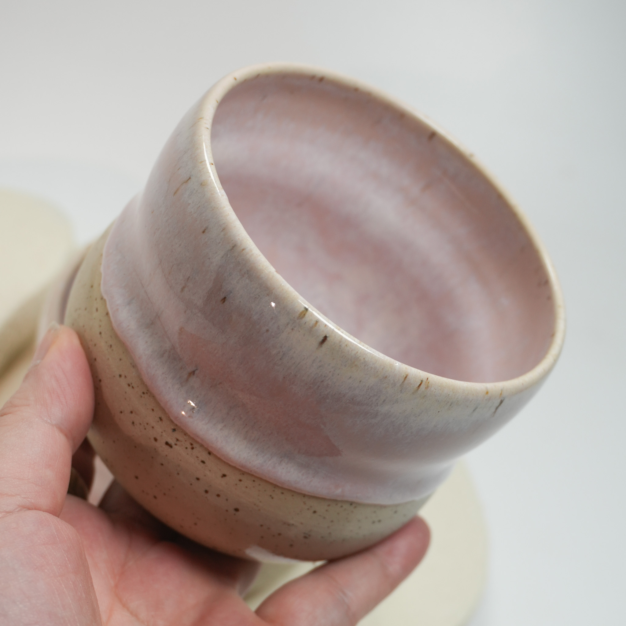 Handgefertigter Becher aus Steinzeug mit einer rosa Glasur und gesprenkeltem Ton. Jeder Becher ist mit viel Liebe handgemacht und dadurch ein Unikat mit leicht variierendem Farbverlauf und kann in Form und Farbe leicht variieren.