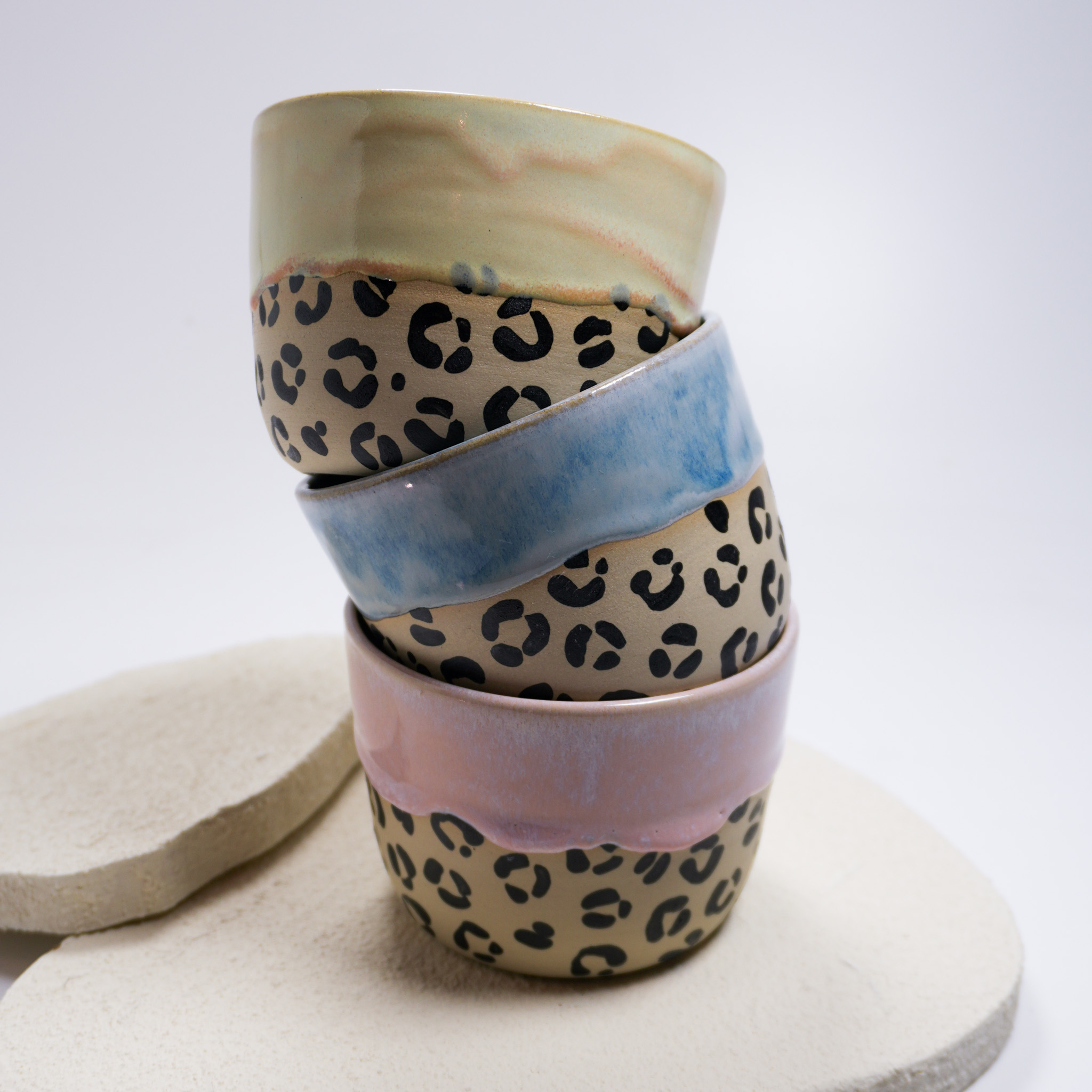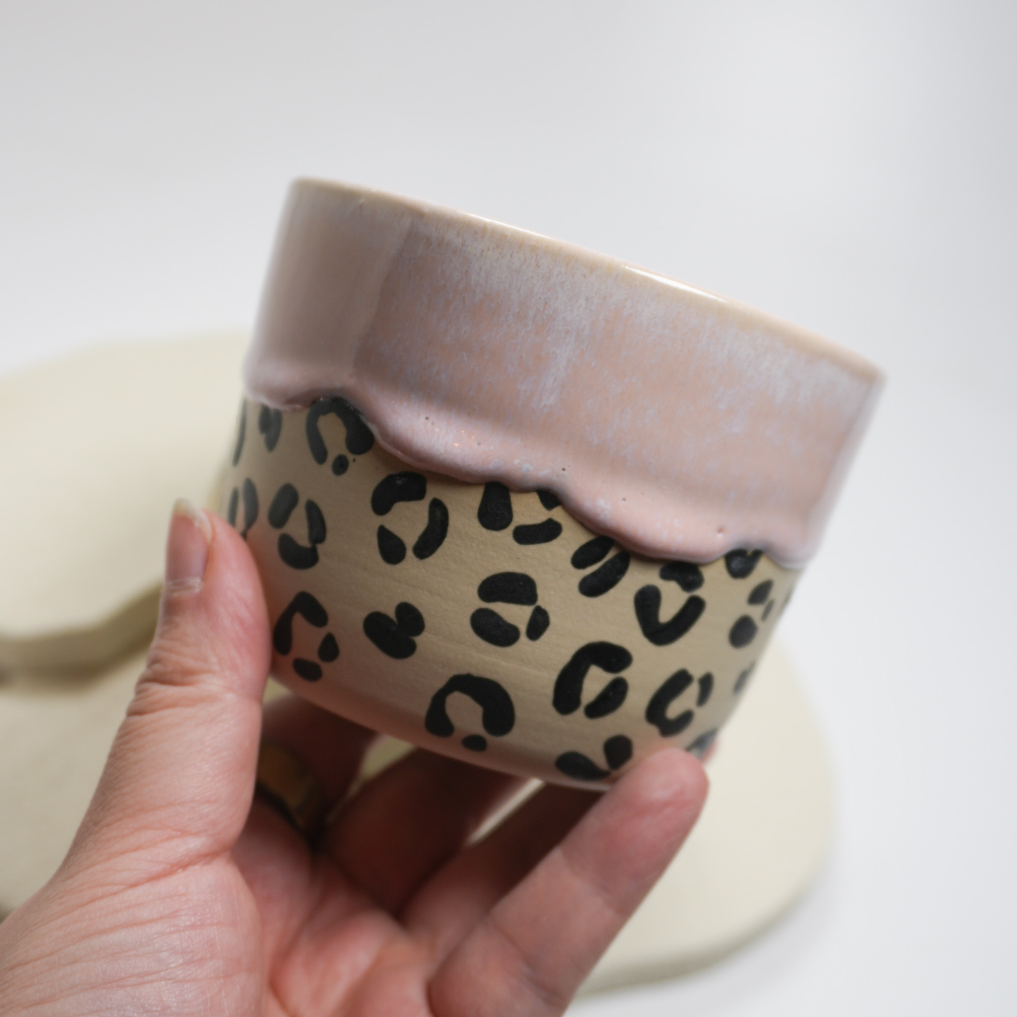 Handgefertigter Becher aus Steinzeug mit Leodesign. Jeder Leofleck ist mit Pinsel einzeln handgemalt und ergibt ein einzigartiges Muster. Die obere hälfte und das innere ist mit einer rosa Glasur überzogen. Jeder Becher ist mit viel Liebe handgemacht und dadurch ein Unikat mit leicht variierendem Farbverlauf und kann in Form und Farbe leicht variieren.